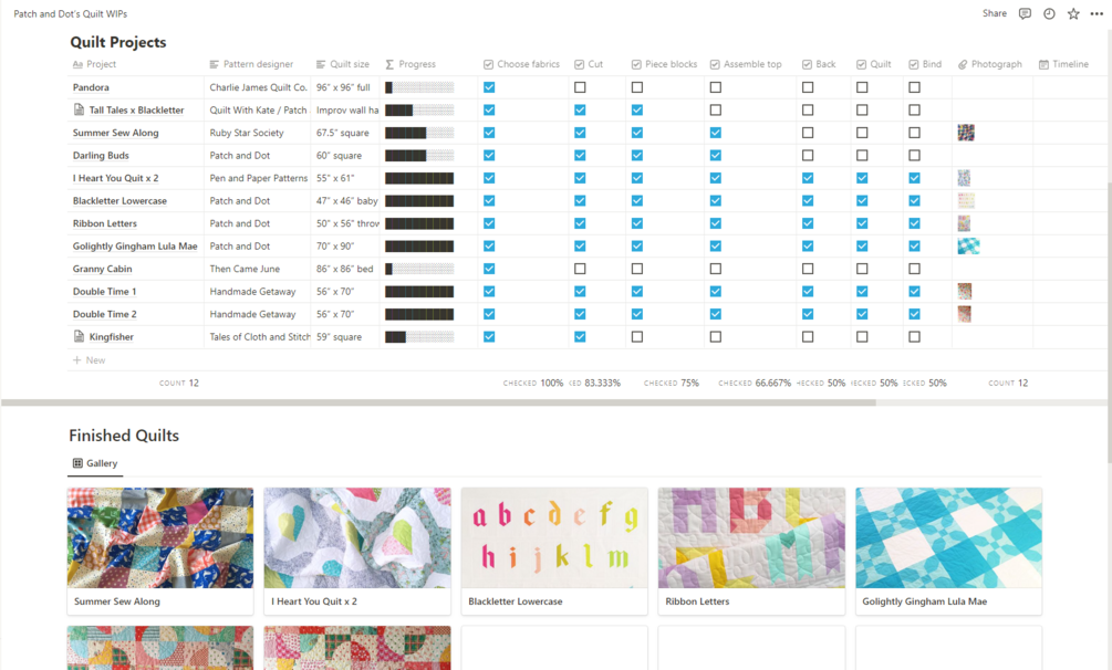 Use Notion to track all your quilt WIPs in one place, and watch your progress bars fill up with every task you complete.